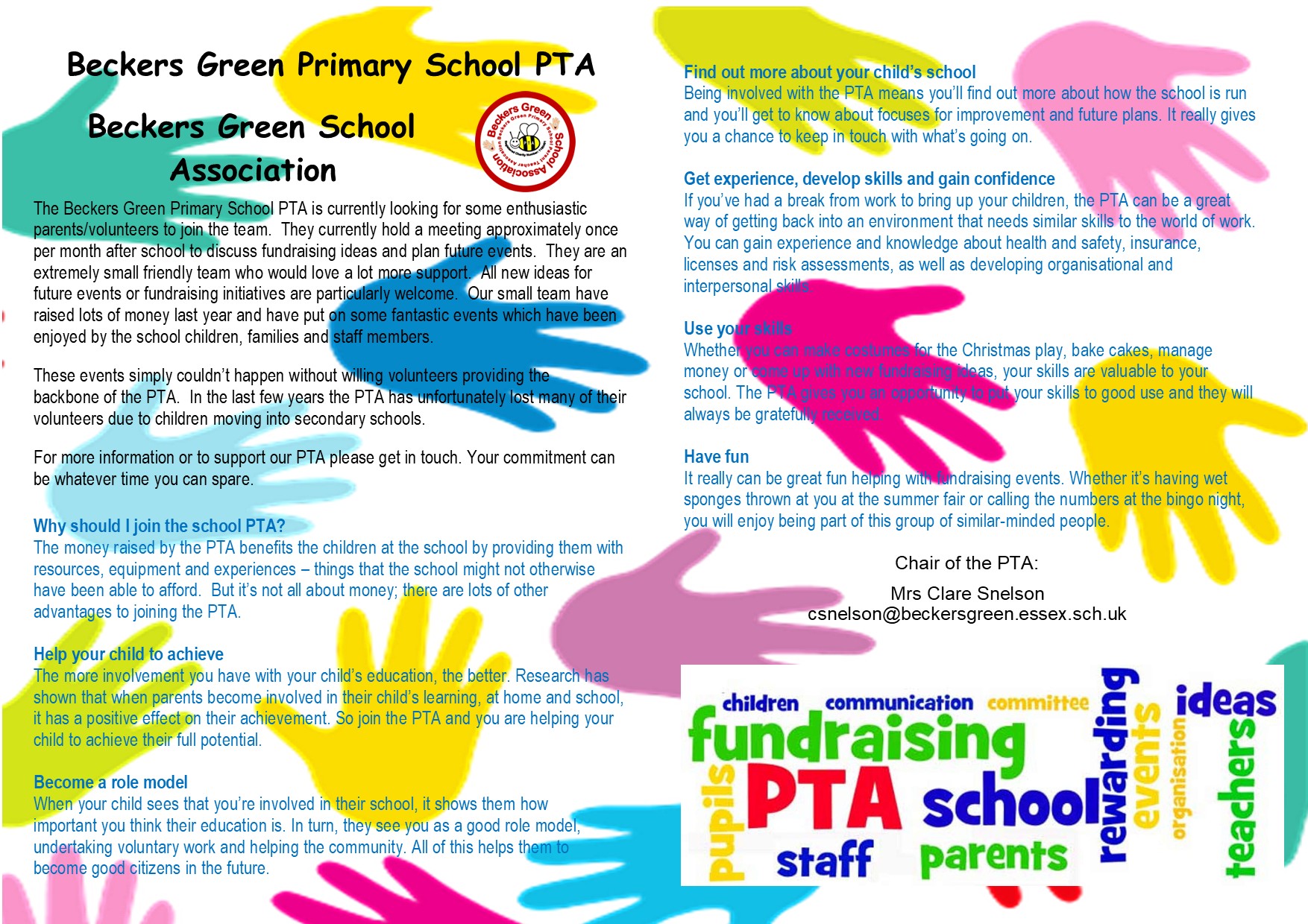 The Beckers Green Primary School PTA is currently looking for enthusiastic parents/volunteers to join the team. They currently hold a meeting approximately once every half term after school to discuss fundraising ideas and plan future events. We are an extremely small friendly team who would love more support. All ideas for future events or fundraising initiatives are particularly welcome. Our small team raised a staggering £5000 last year and have put on some fantastic events which have been enjoyed by the school children, families and staff members.