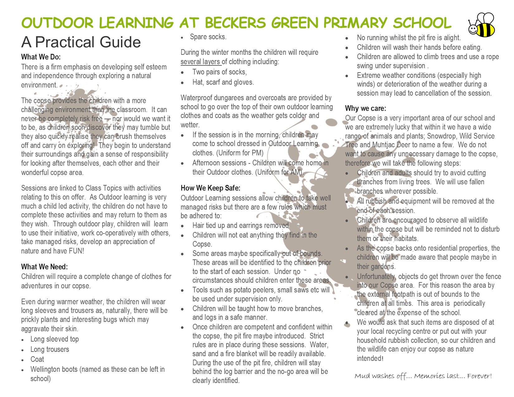 At Beckers Green, we are so incredibly lucky to have the copse, a woodland area, at the back of the playground. Our curriculum, and learning opportunities are designed to use this unique space as much as possible, for example, younger children in EYFS have a weekly outdoor learning slot, where they explore the copse and the outdoor environment for an afternoon a week, in KS1, children take their geography and science lessons outside as well as having time to continue their love in the copse. In KS2, themed days will be held outside, linked to topics, for example the Stone Age.