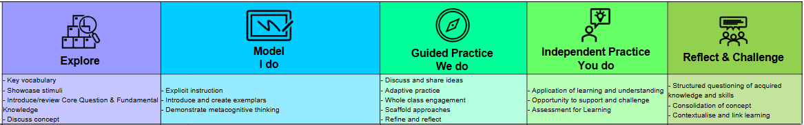 Individual lessons within a unit of learning are planned and taught using the five-step pedagogy that is familiar to pupils and offers opportunities for pupils to revisit their prior learning and consider what they already know before using these foundations to build new knowledge and skills. This planning and teaching structure is used to plan and teach almost all lessons in our school.