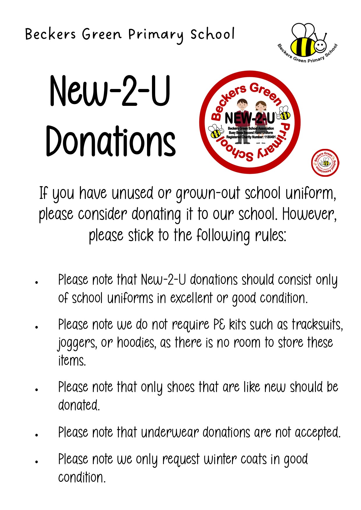 - Outdoor P.E. Kit - white T shirt, black shorts/ jogging bottoms and sweatshirt for winter, plimsolls or trainers (it is important that your child has an additional pair of shoes for P.E.)