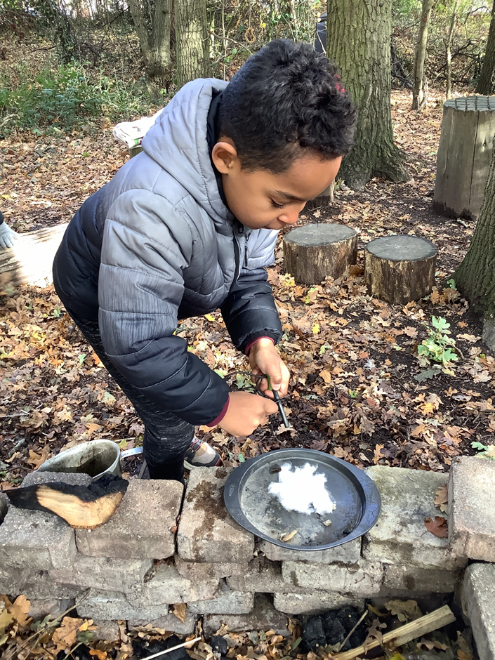 In a session based on using tools, children were invited to use a flint and steel to learn about fire lighting.