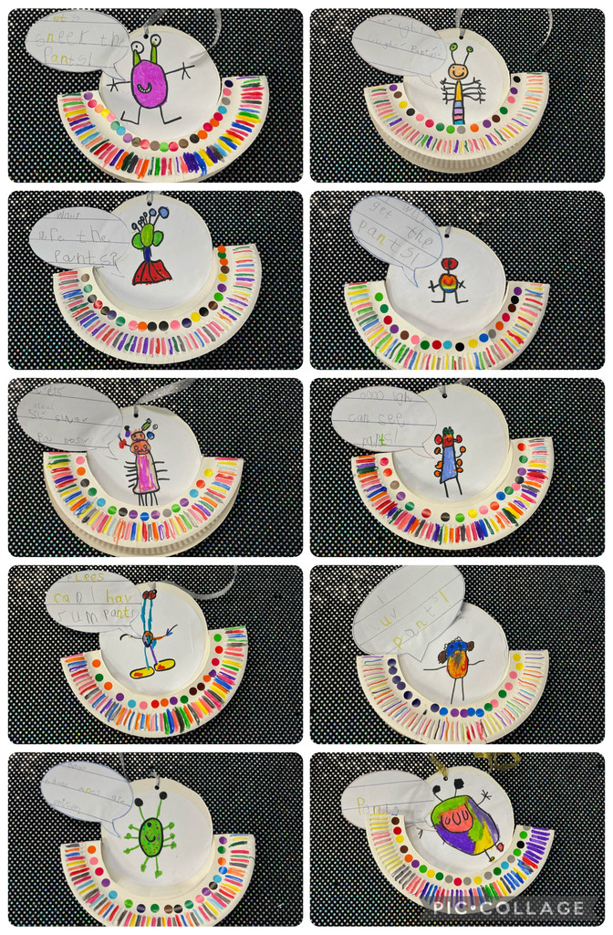 We created paper plate spaceships, and drew an alien to travel inside our spaceship. We explored speech in the Aliens Love Underpants story, then wrote a speech bubble for our alien.