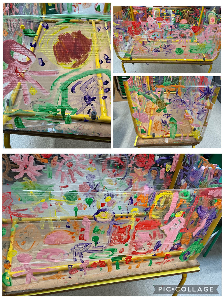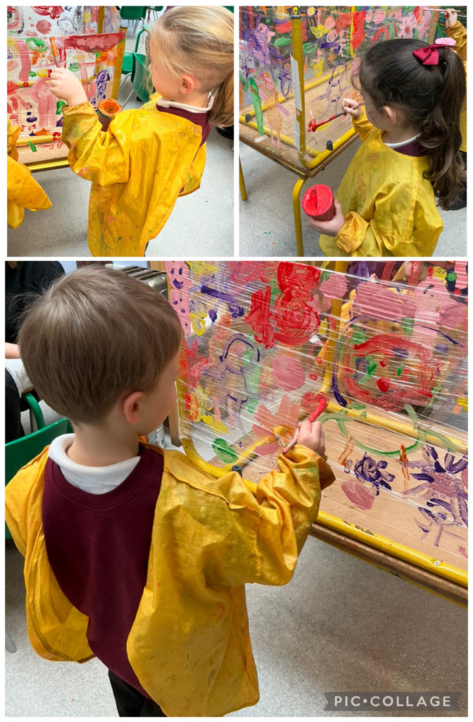 On the creative table, we painted on clingfilm and foil to paint the view from inside a spaceship. A fun and interesting way to paint – the Bears loved it! We explored colour mixing with jars, food colouring, and syringes, building on our previous colour mixing learning with ice cubes.