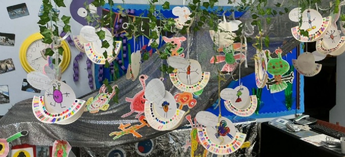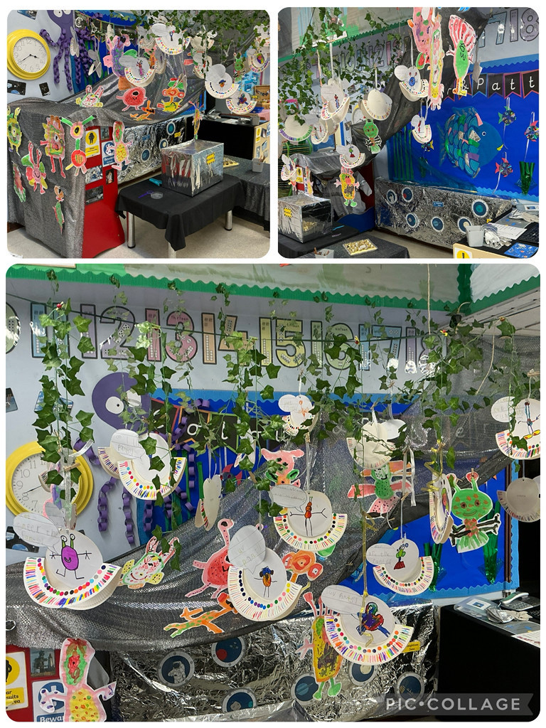 Inspired by the story 'Look Up!', we went outside to paint a meteor shower using a splatter technique. Our meteor paintings have created a background for our 'Look Up!' display to show off our painted aliens, spaceships and patterned pants!.