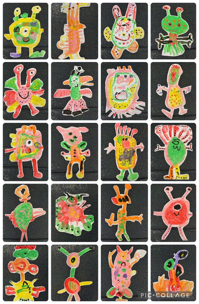 We painted colourful aliens to decorate our space station and painted patterns onto pants to hang on a class washing line.