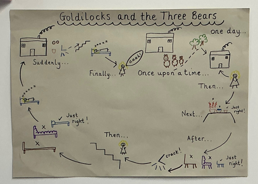 Together we retold the traditional tale to create a class story map. Then on our writing table, we sequenced the pictures and annotated a story map with vocabulary from the Goldilocks and the Three Bears story.