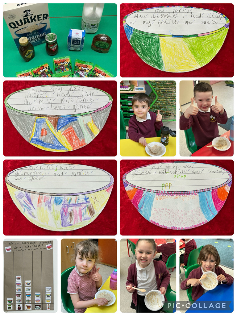 We made and tasted porridge, choosing from a selection of toppings, and wrote about our porridge tasting in our coloured porridge bowl outlines. Most of us loved the porridge, so we had a second serving, and all of us were brave enough to taste something new. Our porridge seemed to be just right! We picked our favourite topping and created a class pictogram to show which topping we liked best.