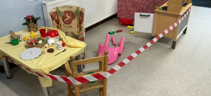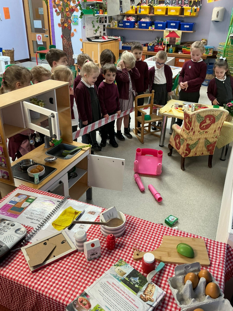 Our role-play transformed into Three Bears cottage. Then one morning, the Bears arrived at school to discover the Three Bears had disappeared. We found a broken chair, the porridge had been eaten, flowers were tipped over, and kitchen utensils were everywhere. Our cottage was really quite a mess! When we recovered from the shock, we set about investigating who could have possibly done such a thing. We all agreed it must have been Goldilocks!
