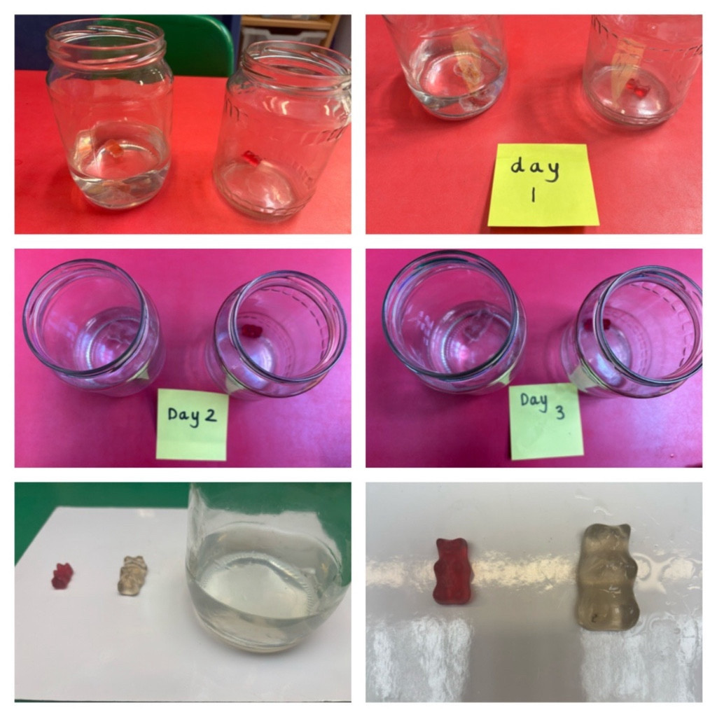 Finally, an osmosis experiment as part of science week, as we investigated what happens when we placed a gummy bear into water, then compared it to an identical gummy bear that had not been in water. We made predictions – the water will turn red, the bear will change colour, it might freeze or melt, the colour will dissolve into the water, the water is white, the bear is red, so the water might go pink. What actually happened – our gummy bear grew larger in the water as the water molecules moved into the bear, thus enlarging it. It also lost its colour and the water changed to a soft pink too. Some of us predicted a colour change but none of us were expecting our gummy bear to float. We were so excited to see the changes in the gummy bear.