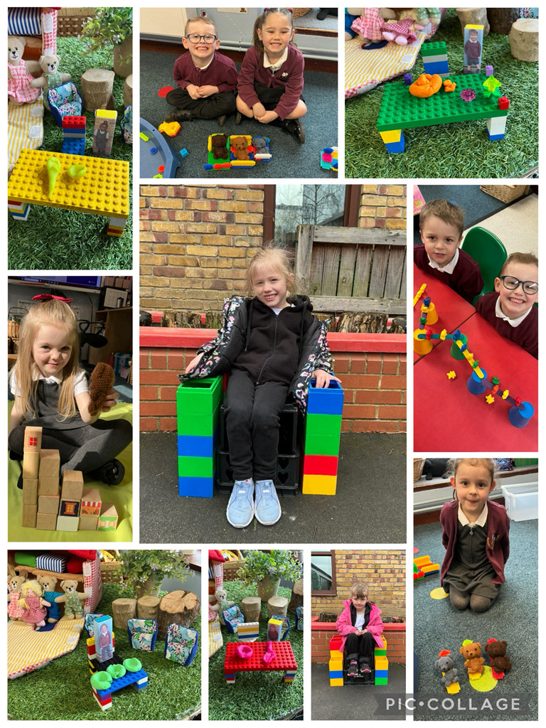 Feeling quite fed up with the naughtiness of Goldilocks, we designed and built a trap to stop her. We had to think about what we would need and how it would work. This worked well when the trap was laid on the carpet, but some of us needed to make some alterations because when we picked up our trap to show how it would work, Goldilocks fell right out and that just wouldn't do! We thought we should replace the broken furniture, so we used our construction materials to make new chairs, tables and beds for the Bears.