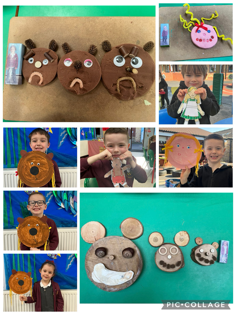 On our practical table, we made playdough story characters with cutters, tools, and collage materials and larger loose part bears with natural resources. We cut and fixed together split pin Goldilocks and Three Bears. It was quite a challenge to cut carefully, and try not to lose a body part. We explored capacity with porridge oats and water, and sorted everyday objects into groups of hard and soft materials.