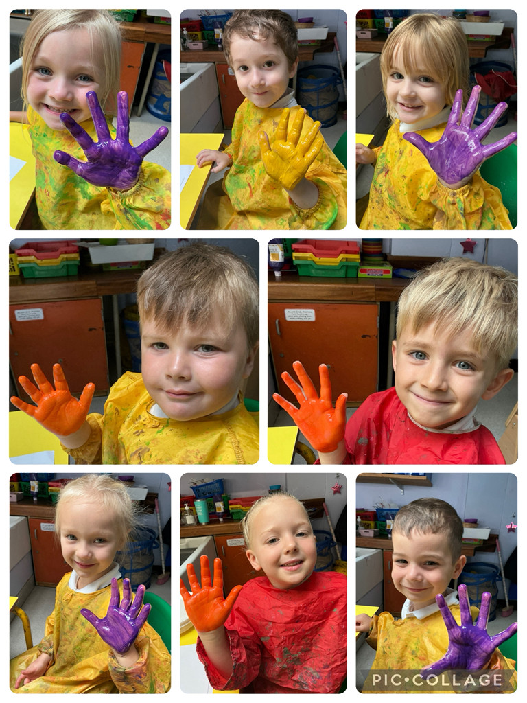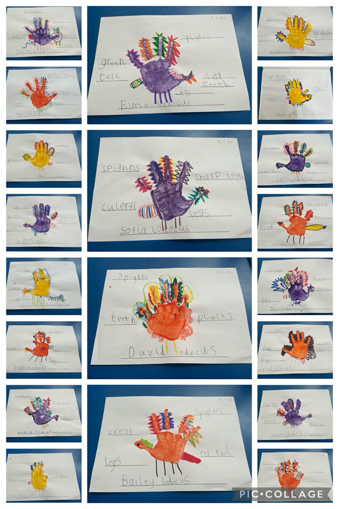 On the creative table, we printed handprints then turned them into dinosaurs, adding dinosaur features like frills, horns and spikes. We named our handprint dinosaurs and labelled the features we had drawn.