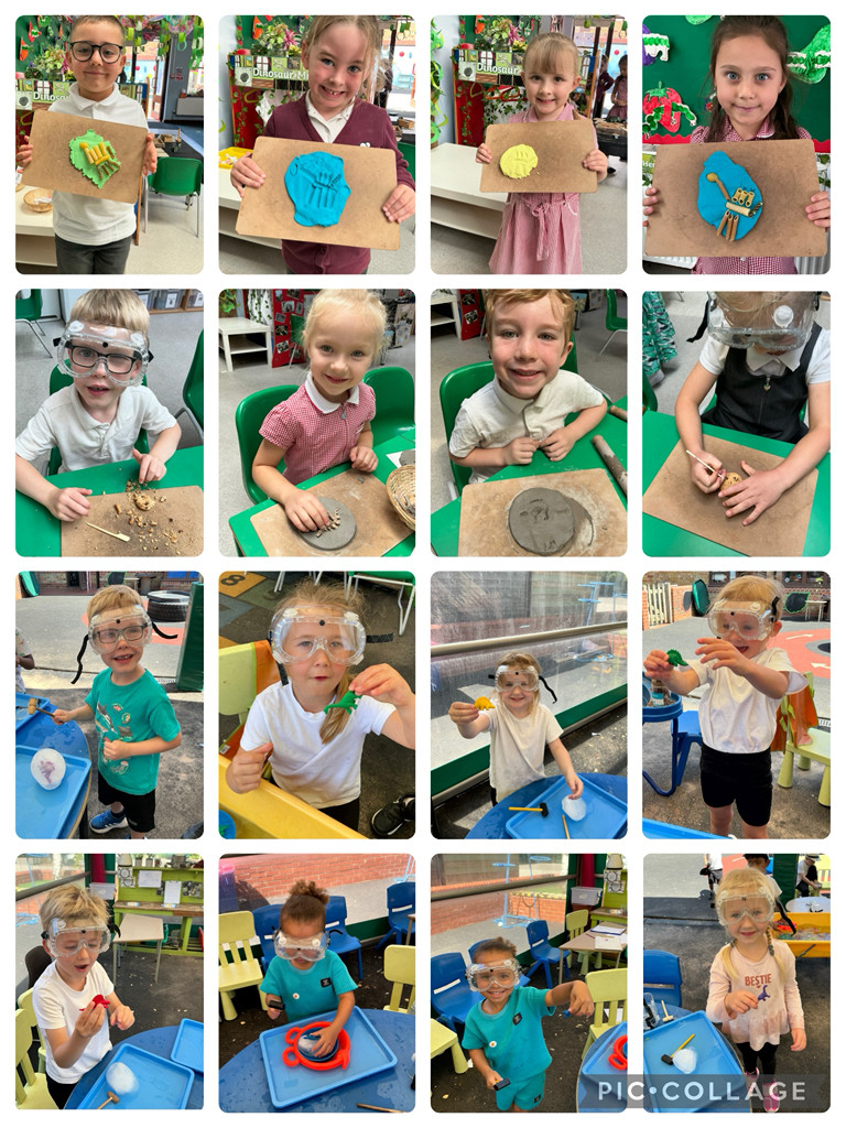 We practised our palaeontology skills to unearth chocolate chips from cookies, and unearthed dinosaurs from sand and ice. Next, we made our own dinosaur fossils with pasta and playdough. Finally, we made a fossil by rolling clay into a ball, rolling it, flattening it and pressing a dinosaur skeleton into the clay.