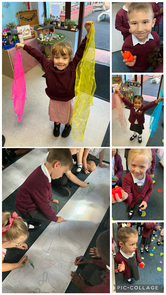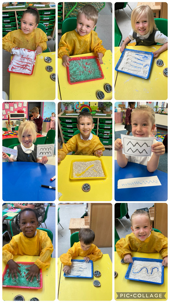 Lots of mark making in different sensory trays and some swishing and twisting with dance, music and large movements. We manipulate playdough in Dough Disco and have a weekly fun pen disco.