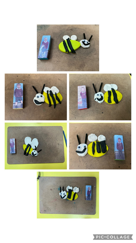 Next, Our School with the story of the week: Starting School by Janet and Allan Ahlberg. Small world was a school scene, to play and act out school with our mini me blocks, and we took tours of our new school to visit different areas and meet staff. We practised our cutting skills by sticking school uniform to our body outlines, and we made friendship bracelets to give to a new friend. We even copied our school badge to make a playdough Beckers Bee.