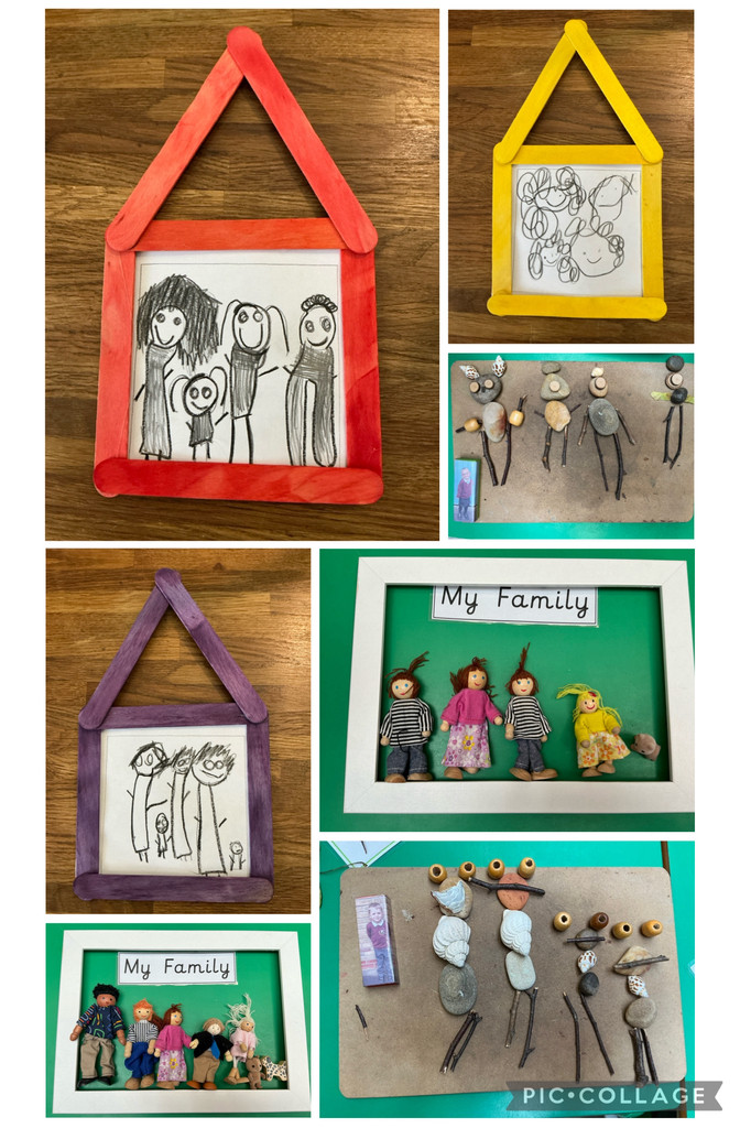 My Family week introduced us to the much-loved Large Family stories written by Jill Murphy. We created family portraits with pencils, play people and loose parts. We displayed our pencil family portraits in wooden lolly stick houses.