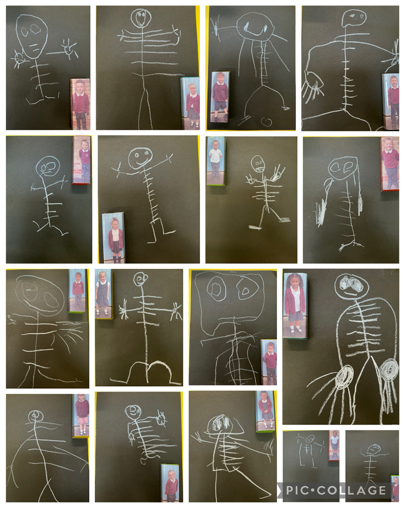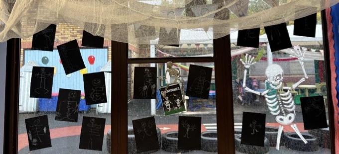 We created skeletons in every area of our Bears classroom, on chalkboards, with chalk on black paper, cotton bud skeletons, pipe cleaner skeletons, playdough skeletons, skeletons drawn on the playground, loose part skeletons and even large jigsaw skeletons too. Please take a look at the skeletons on display in our book area.