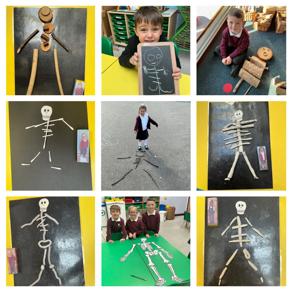 In outdoor learning, we continued our Funny Bones theme by making skeletons using sticks and logs. We had a little competition between the colour teams in the Antelopes and Bears. Great teamwork as we worked together to find different sized sticks and logs and talked about which parts we needed. We had a spine, ribs, skull, arms and legs. Our skeletons were super!