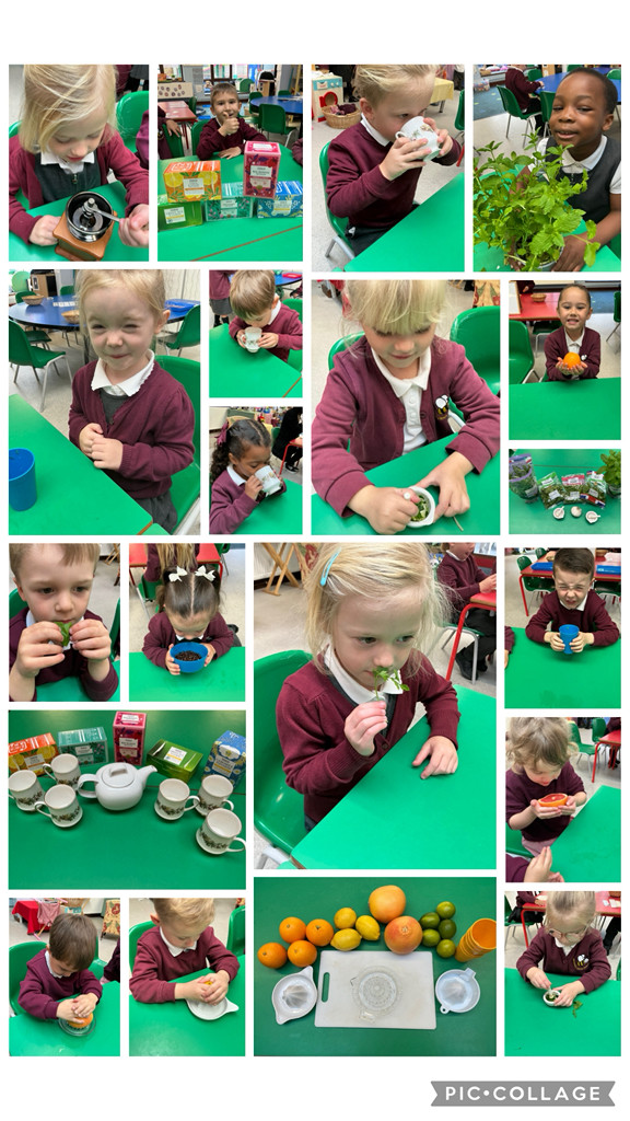 On the practical table, we explored our senses with flavoured teas, herbs, spices, coffee beans, and citrus fruits. We were encouraged to look closely, smell, taste and describe them. We thought about what the aromas reminded us of - toothpaste, curry and chocolate.