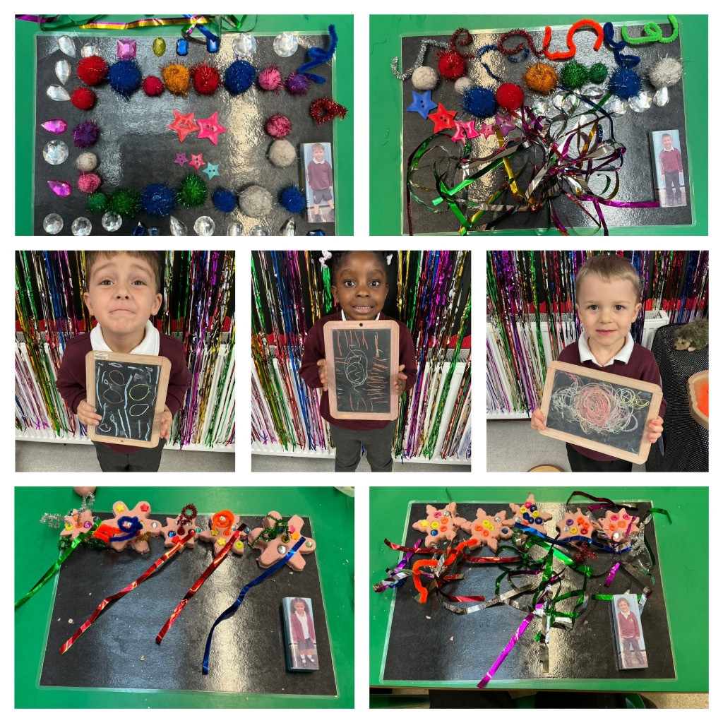 On the practical table, we used sparkly collage materials, then coloured playdough and glitter to make firework scenes on the laminated black mats.