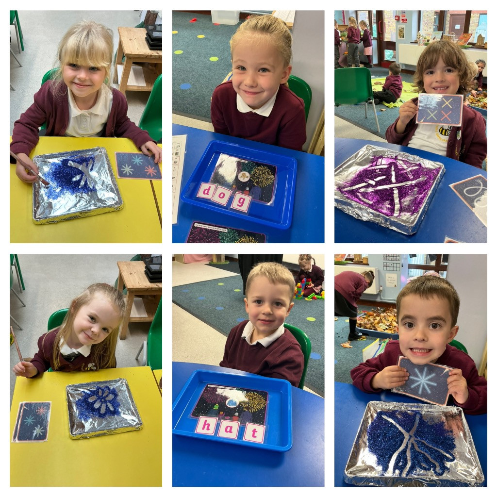 On the writing table, we made marks and patterns with fingers and sticks in bright-coloured glitter and sand. We built CVC words on firework word mats, and used our phonics to write firework food words and a description of a firework display.
