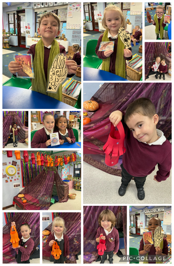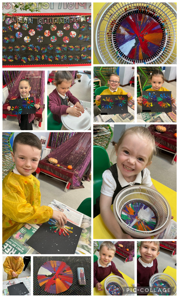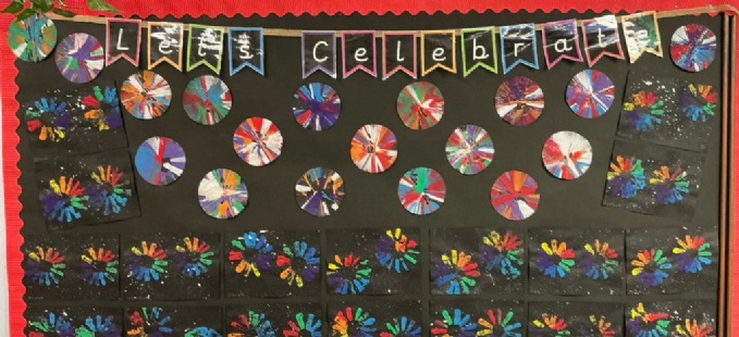 Fireworks play a significant role in Diwali celebrations, as fireworks light up the sky and drive out the darkness. In Bears, we created firework pictures with a salad spinner to whizz paint around, then we sprinkled on some glitter. We also created messy but fun firework splatter and printed paintings. Now we have a wonderful firework celebration display in our classroom.
