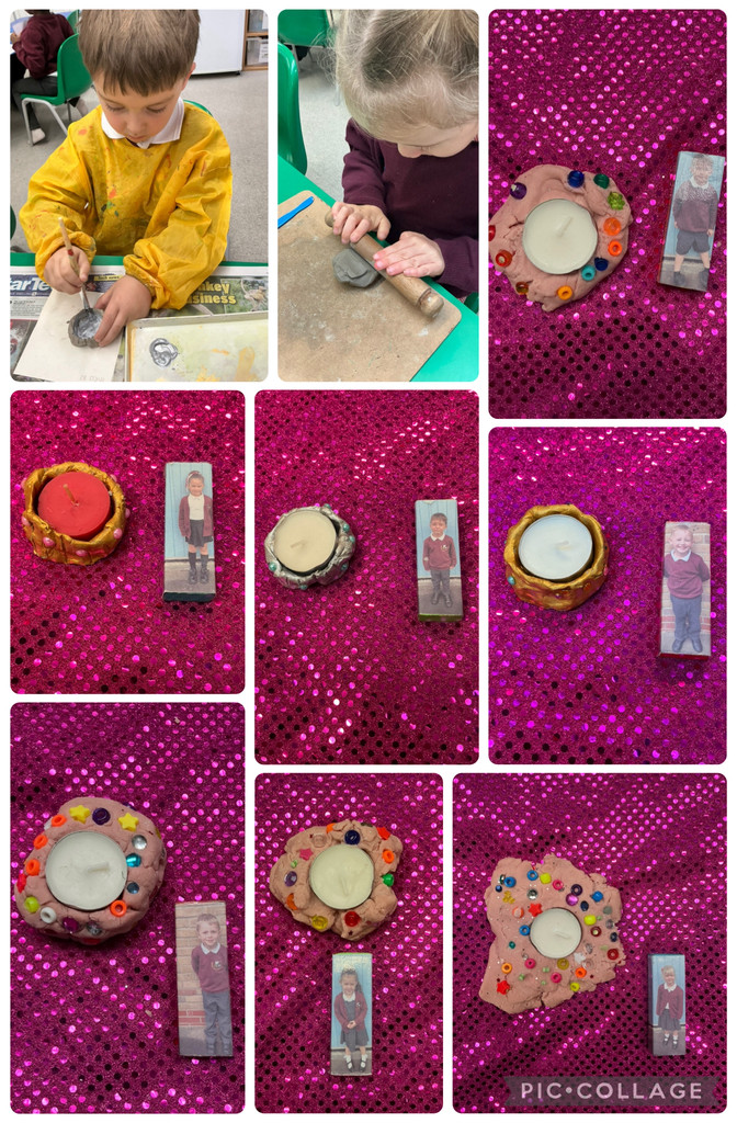 On the practical table, we created diya lamps with sparkly playdough and beads. Later in the week, we progressed to clay. We modelled the clay, then painted and decorated our lamps.