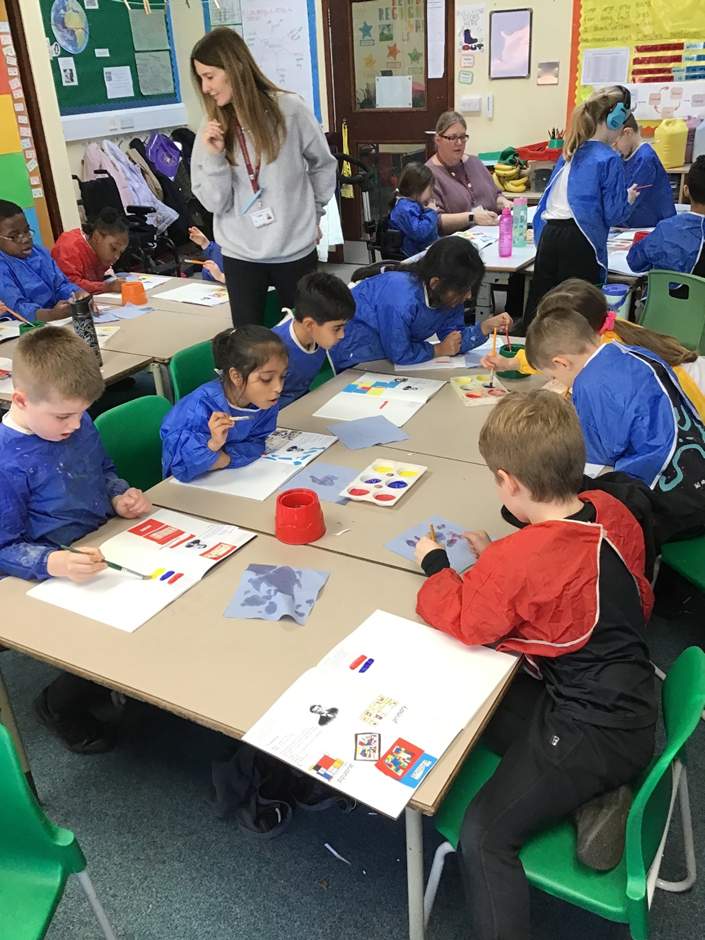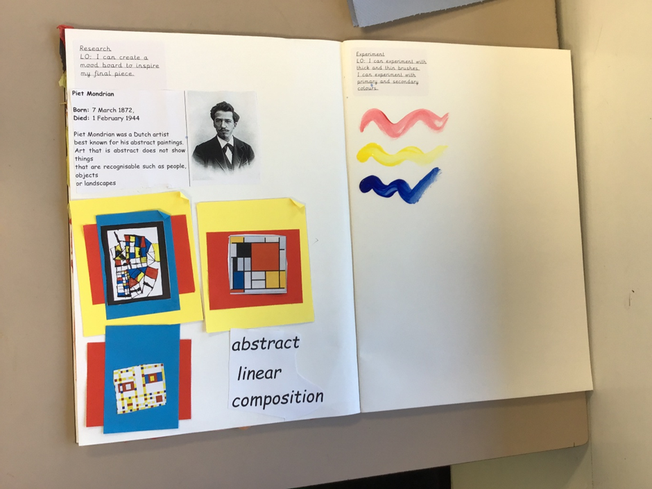 Our art lessons started with researching the artist Mondrian and his work, creating mood boards to inspire our final artwork and learning technical vocab linked to this: