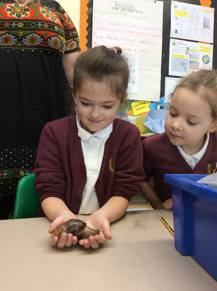 On Tuesday we had a visit from Turbo the African Land snail. Turbo belongs to Mrs Ward and he came into visit us to help with our literacy. This weeks focus was recount writing and we wanted to write about the visit from Turbo. We looked at what a recount is, the features of a recount (chronological order, using time connectives, writing in the past tense ad using interesting adjectives to make our writing more interesting). The children then planned the recount writing as a whole class and then wrote their own at the end of the week.