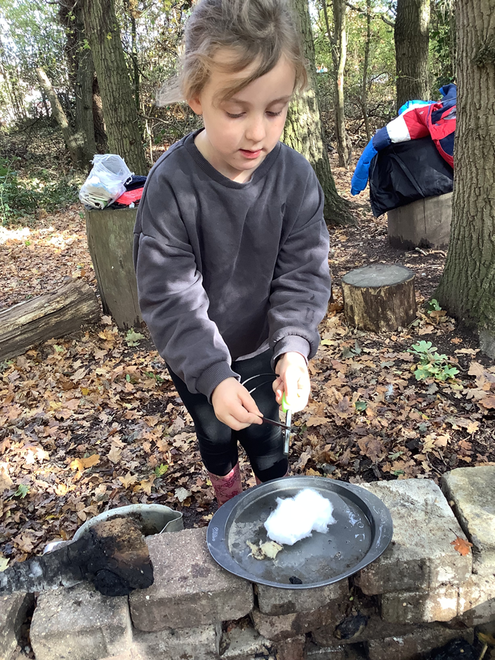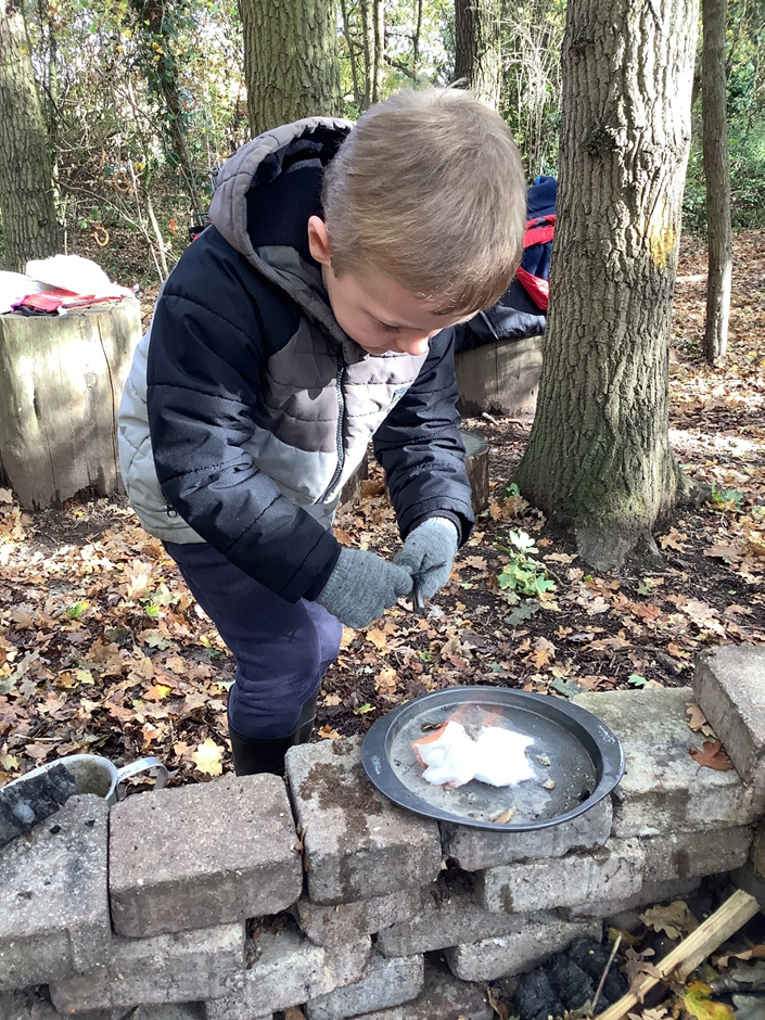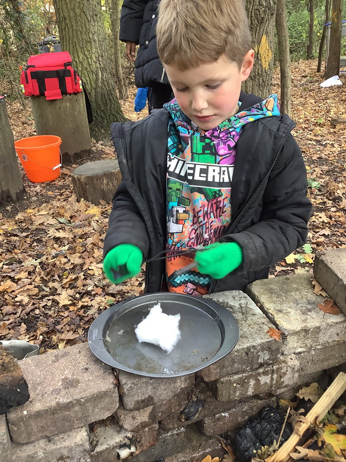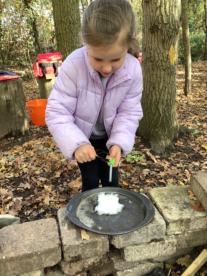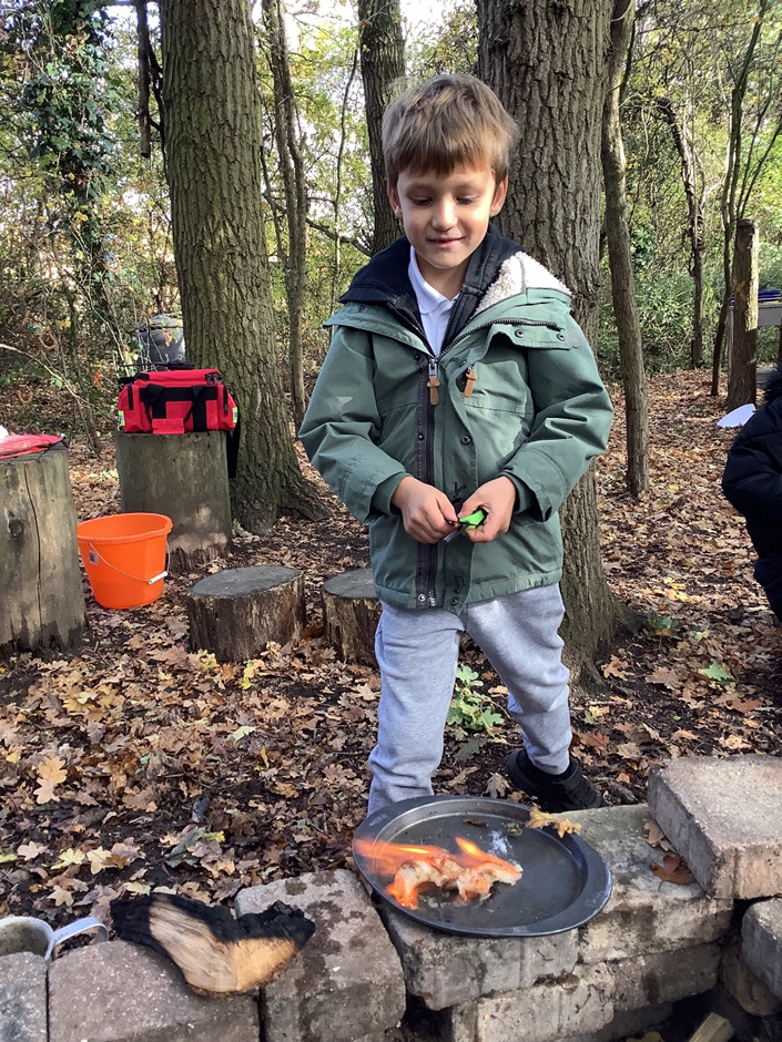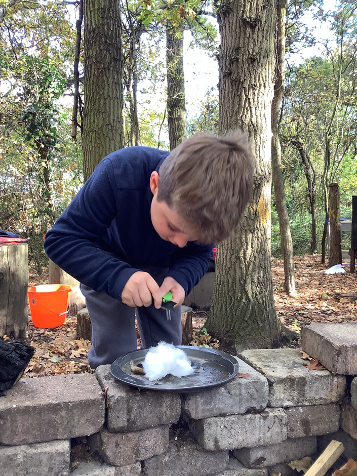 Risky play is an important part of developing resilience, risk assessing skills and physical skills, along with team work and happens naturally in the copse (under supervision of course!) Today the children had an invitation to learn how to use a flint and steel to light their own fires: